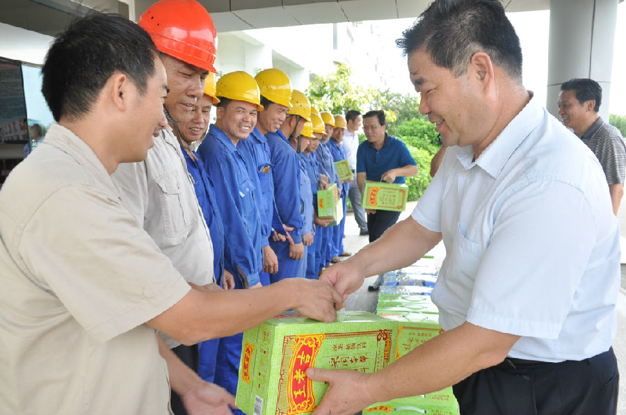 炎炎夏日,太阳高挂,室外温度高达38度以上,县总工会此次送清凉慰问,给炎热的夏日带来了一丝清凉。周鹏昌主席在公司领导的陪同下,看望、慰问了在高温酷暑中仍坚守在岗一线工人,同时为他们送去了凉茶、毛巾等降温物品。周鹏昌主席在慰问活动中一句句“你们辛苦了,谢谢大家的辛勤工作!,天气热,大家要注意身体,做到劳逸结合”关怀的话语和亲切的慰问,让一线工人确实感受到了县总工会作为“娘家人”的真挚关爱。