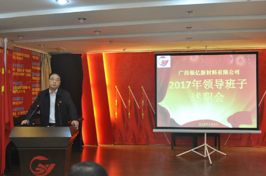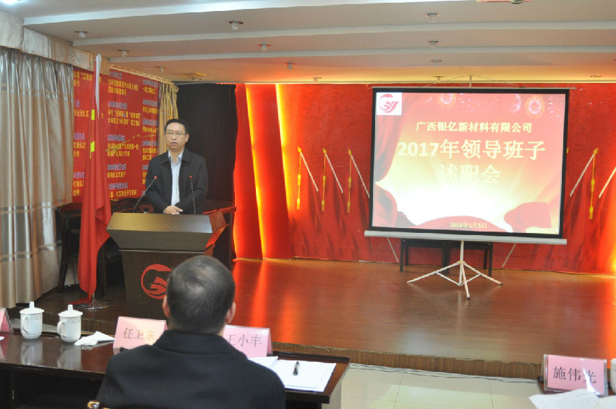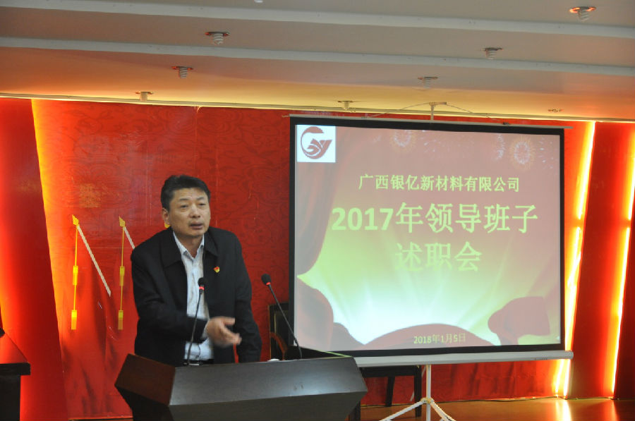 广西银亿于1月5日上午8时30分在办公楼三楼党员活动室隆重举行2017年度领导班子述职报告会,述职会由党委委员章群宏主持,参加高层述职评议人员是全体中层以上干部47人,集团公司副总裁施伟光也莅临现场参与评议,并作了精彩点评。